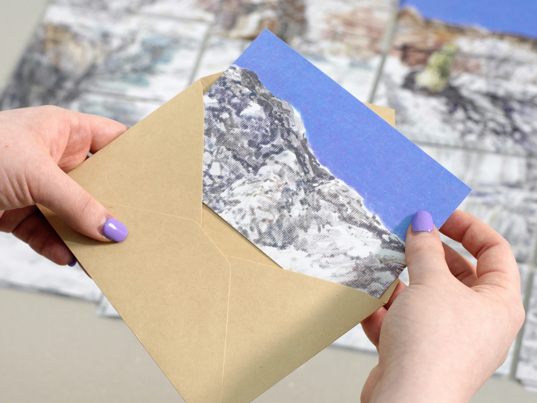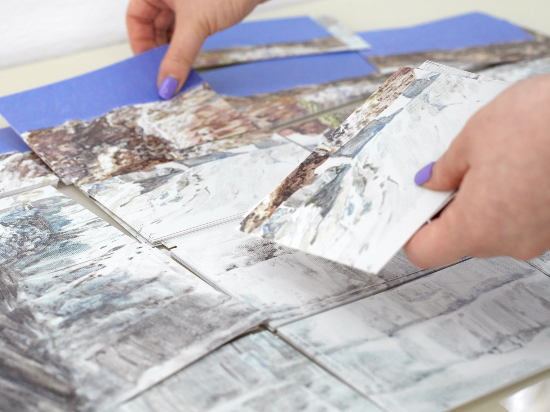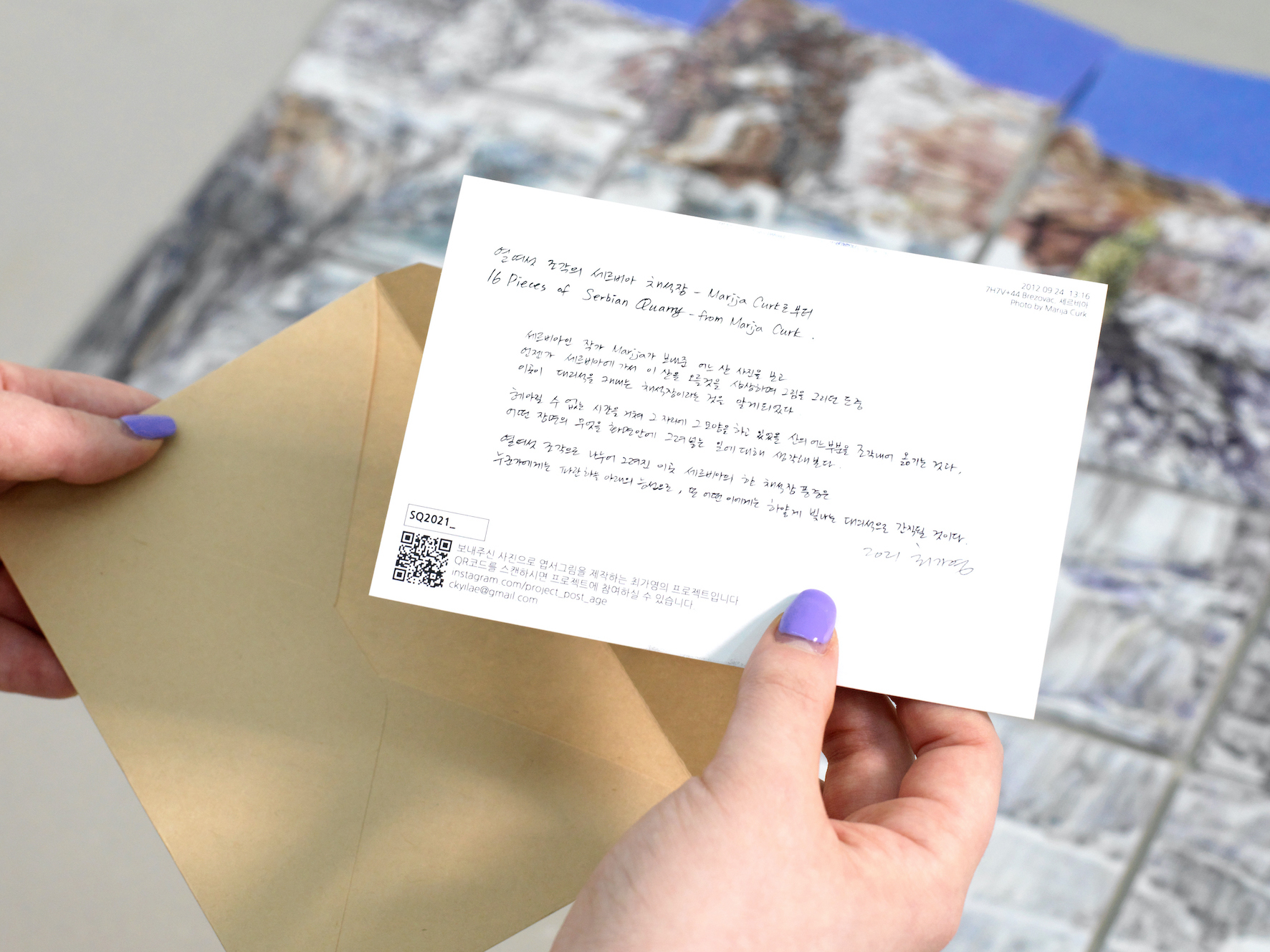 <Post-age>라는 이름의 프로젝트로 진행하고 있는, 엽서그림으로 만든 그림엽서입니다. 한 장의 사진 속 이미지를 엽서 크기의 화면 여러 개에 나누어 그린 다음, 촬영과 프린트를 거쳐서 엽서를 만듭니다. 이번 위드아트에서 판매하는 엽서는 세르비아의 한 채석장 풍경을 열여섯 조각의 화면으로 나누어 그려서 만들었습니다. 엽서 이미지에 대한 소개와 그림 조각의 좌표정보, 프로젝트에 대한 QR코드 등을 함께 발송해드릴 계획입니다.