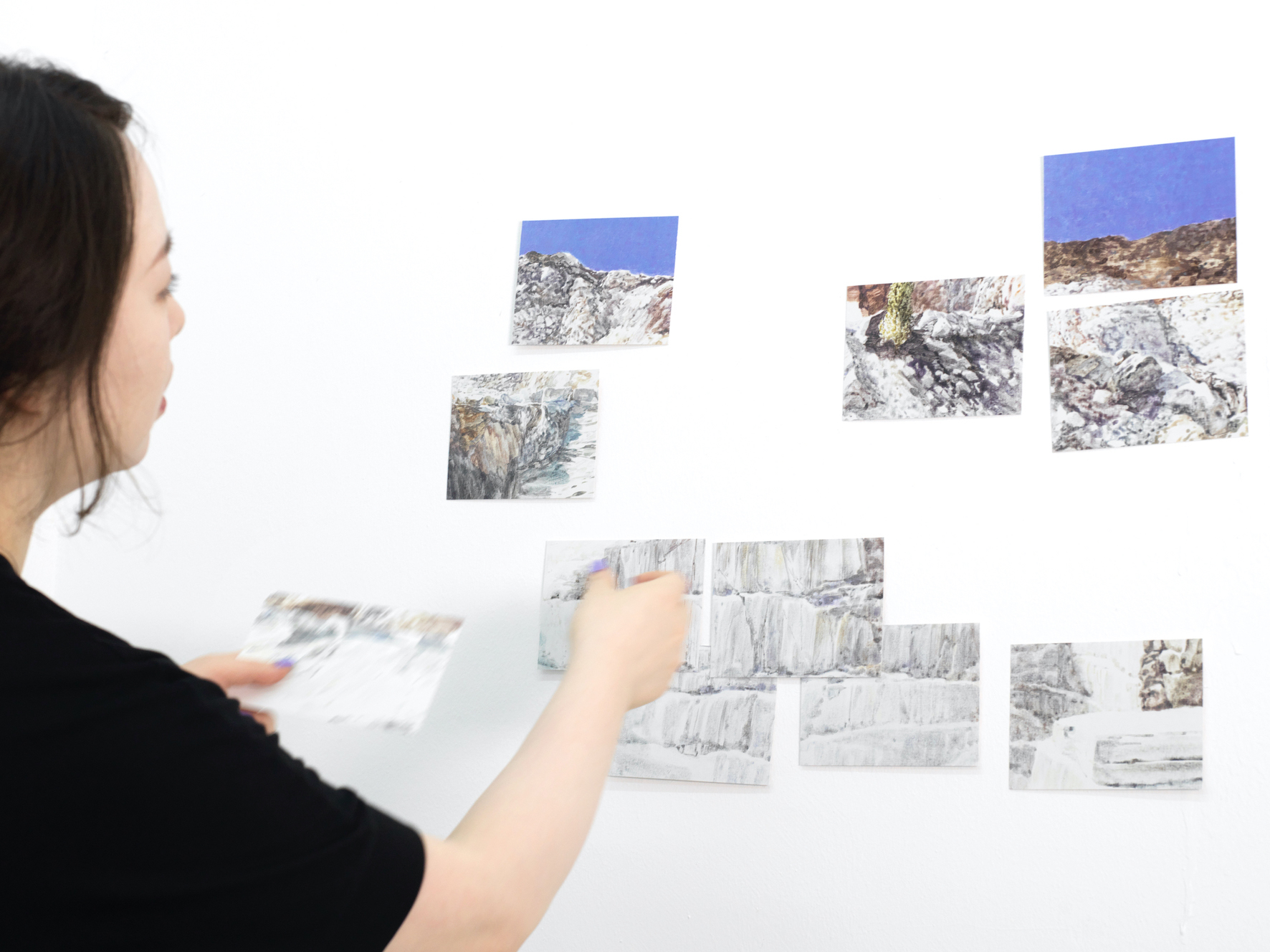저의 개인적인 관심사와 작업 과정에 대한 생각을 담았습니다. 앞서 말씀 드린 대로 저는 엽서를 수집하는 취미가 있는데요, 엽서 속 풍경이 발신과 수신을 거쳐 전혀 다른 시공으로 옮겨진다는 점에서 흥미가 있어요. 마치 산에서 돌을 캐내어 옮기는 일과 비슷하다고 느낍니다. 헤아릴 수 없이 오랜 세월을 거쳐서 그러한 모양을 하고 그 자리에 있었던 산의 일부를 뚝 떼내어 어딘가로 실어 나르는 채석장 풍경을 보면 여러 가지 감상들이 떠올라요. 그림을 그리는 과정과도 닮아있다는 생각을 합니다. 저의 일상으로부터 채굴된 생각들과 이미지들을 화면이라는 비현실적인 공간 안으로 옮겨서 그려낸다는 점에서요.