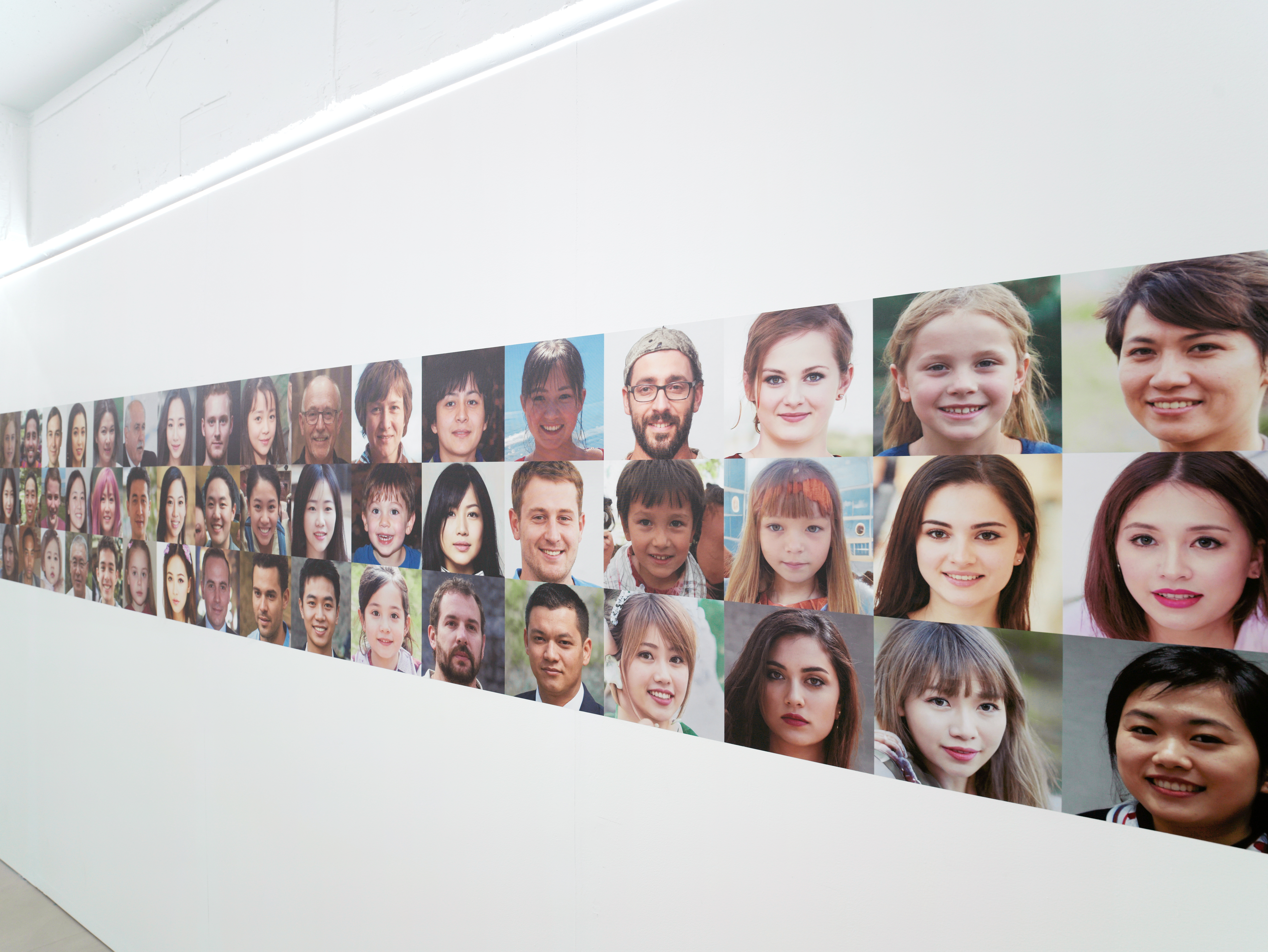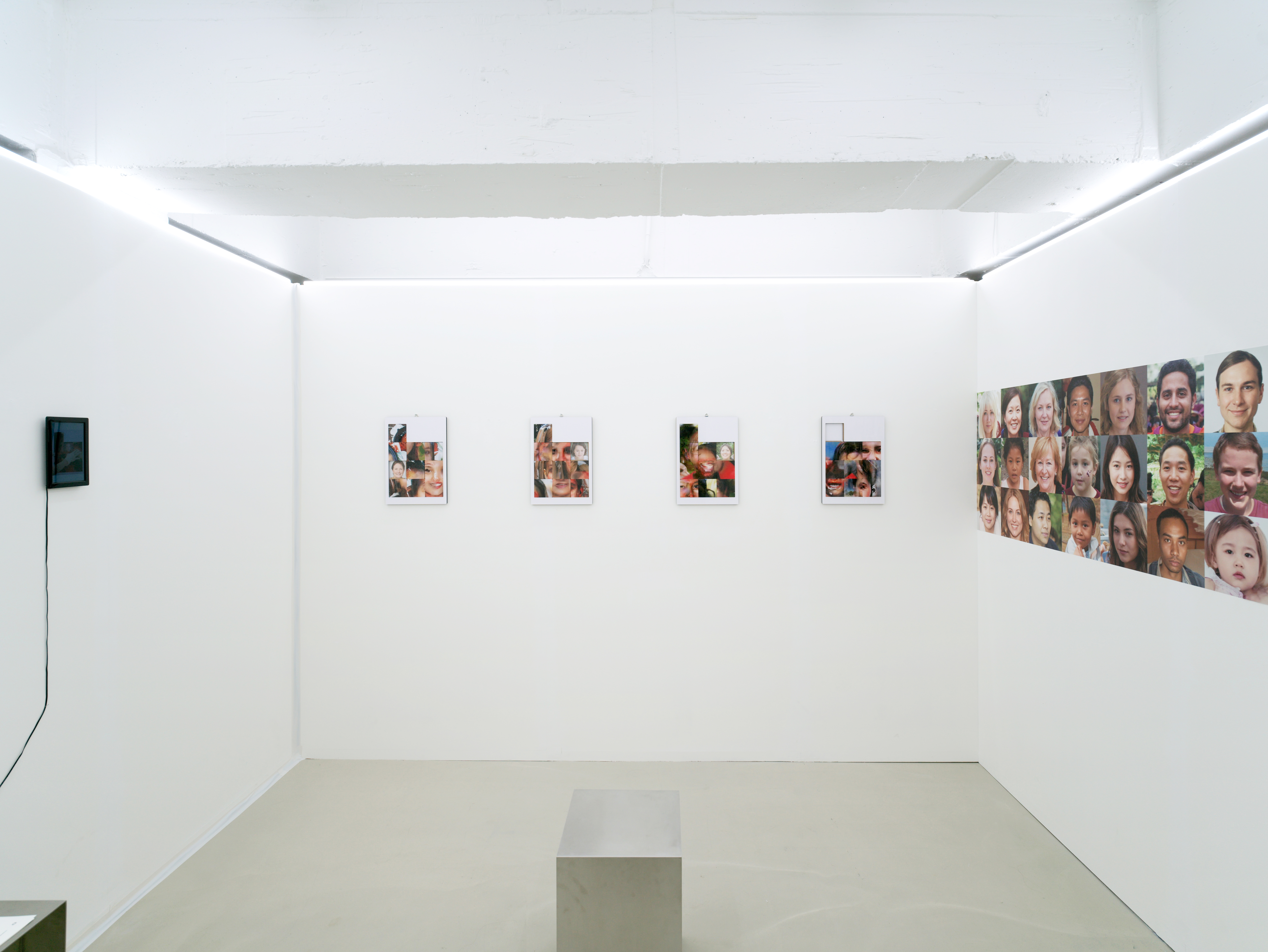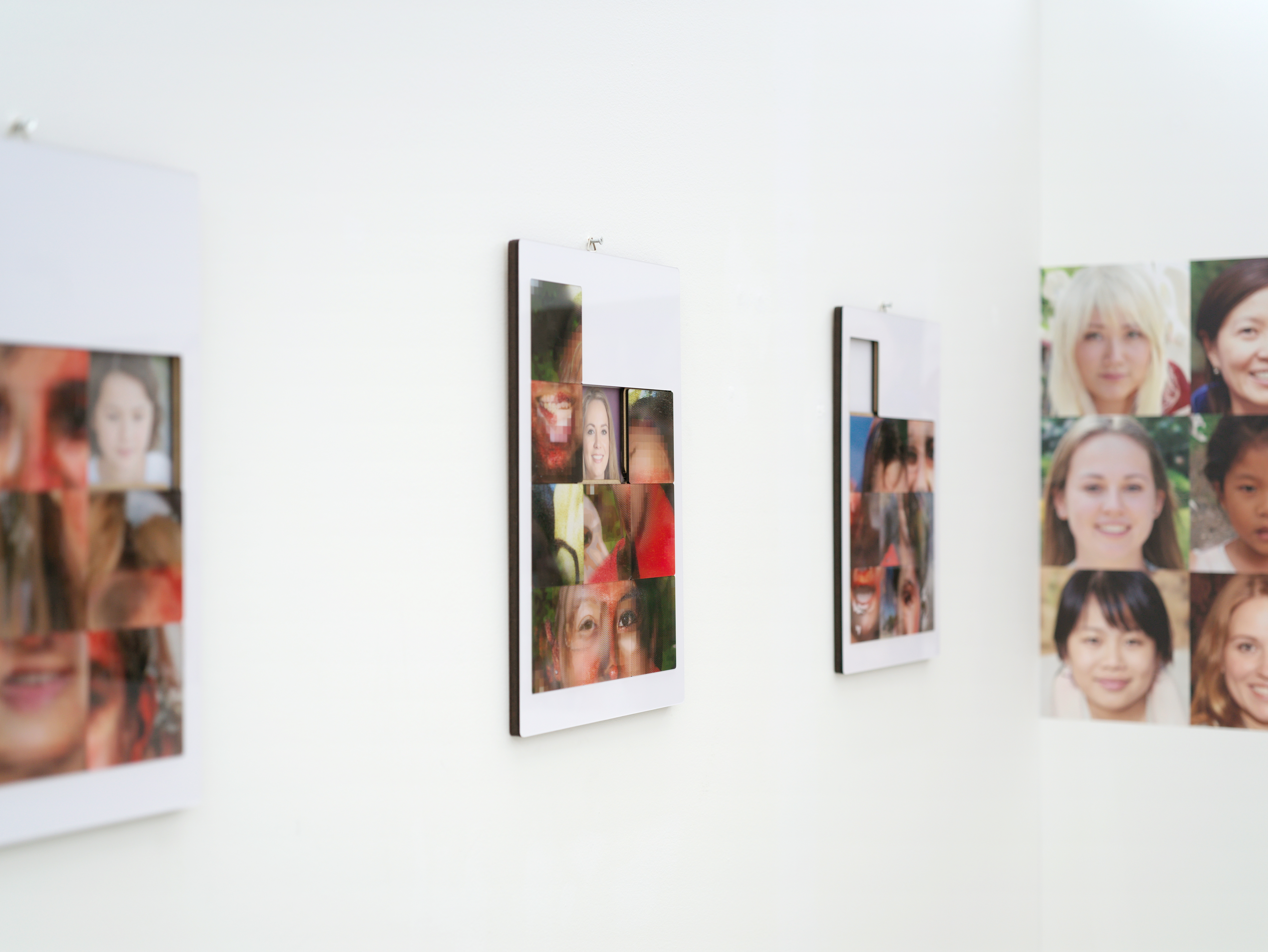 서지수는 그런 변화의 흐름 중 현재 자신이 경험하고 있는 현실과 가상 공간의 관계에 주목한다. 온라인과 오프라인으로 나뉘던 시기는 이제 온 오프의 속성을 넘어 ‘공간, 사회’로서의 물리적 개념까지 함축한 ‘가상 공간’과 ‘현실’의 구분으로 확장되었다. 서지수는 이 개념의 관계를 자신이 경험하는 가장 밀접한 현상으로 표현한다. 그 중 하나는 일상적으로 두 속성의 공간을 넘나들며 겪는 기이한 익숙함과 낯섦에 관한 것인데, 이번 전시 <Face Face>에서 그 기이하고 미묘한 감각을 존재하지 않으나 있을 법한 가상의 얼굴들을 현실에 들여놓음으로써 드러낸다. 전시장에 있는 모든 얼굴, 사람은 그 어디에도 존재하지 않는다. 무작위 합성에 의해 생성되었다고는 믿기지 않을 만큼 익숙하다. 누군가 각 얼굴에 이름을 붙여주었다면 우리는 의심의 여지없이 ‘존재하는 그’를 보고 있는 경험을 했을 것이다. 현실에서 관계한 누군가를 가상공간에서 디지털 이미지로 마주했을 때 알 수 없는 낯섦을 경험한다는 서지수는 이 미묘한 감각의 오차와 균열에 대해 부정하지 않는다. 부정하기보다 오히려 이 균열이야말로 매 순간 두 가지 다른 속성을 구별하고 사유하게 하는 하나의 계기로써 작용할 수 있다고 말한다.