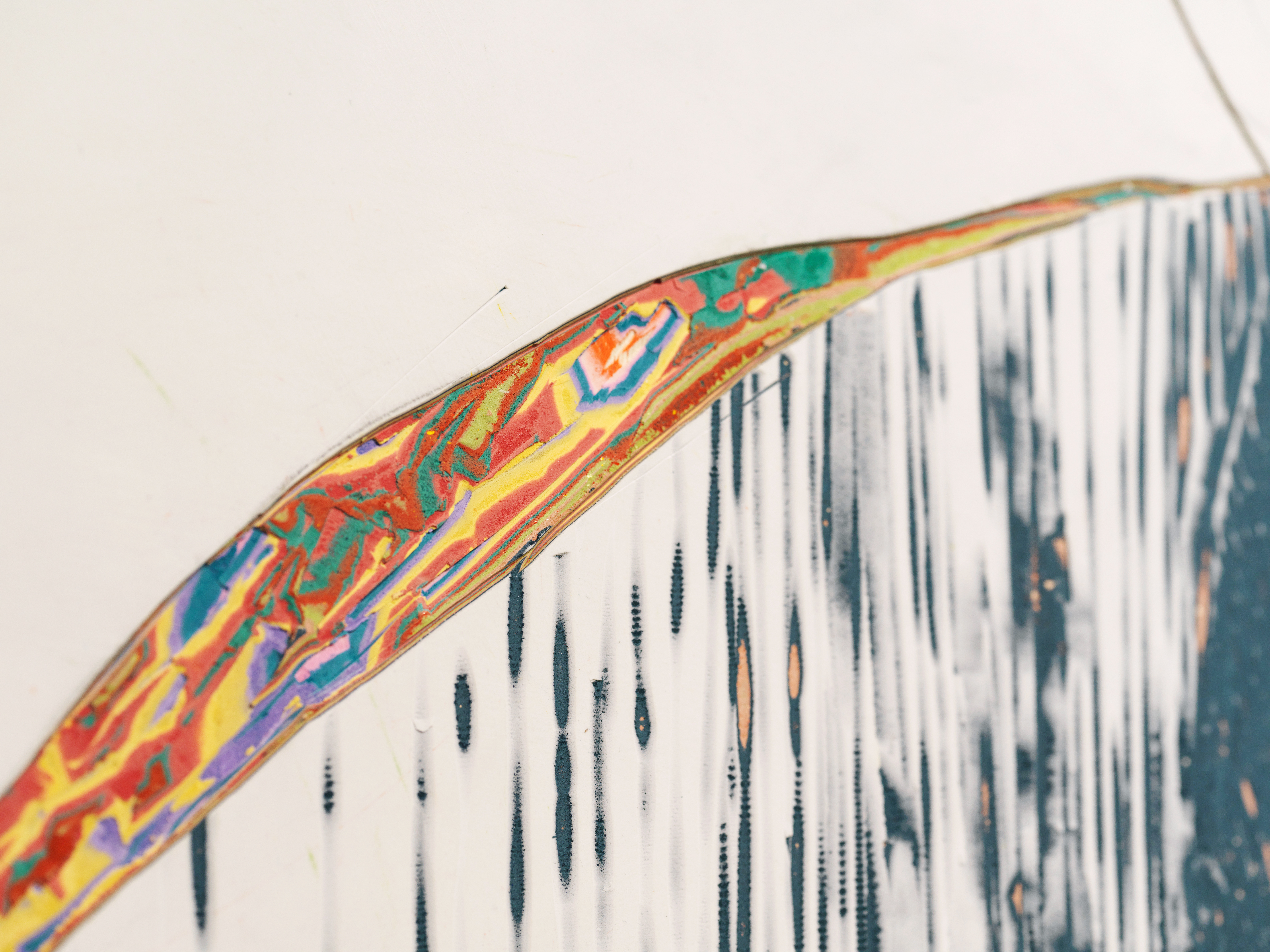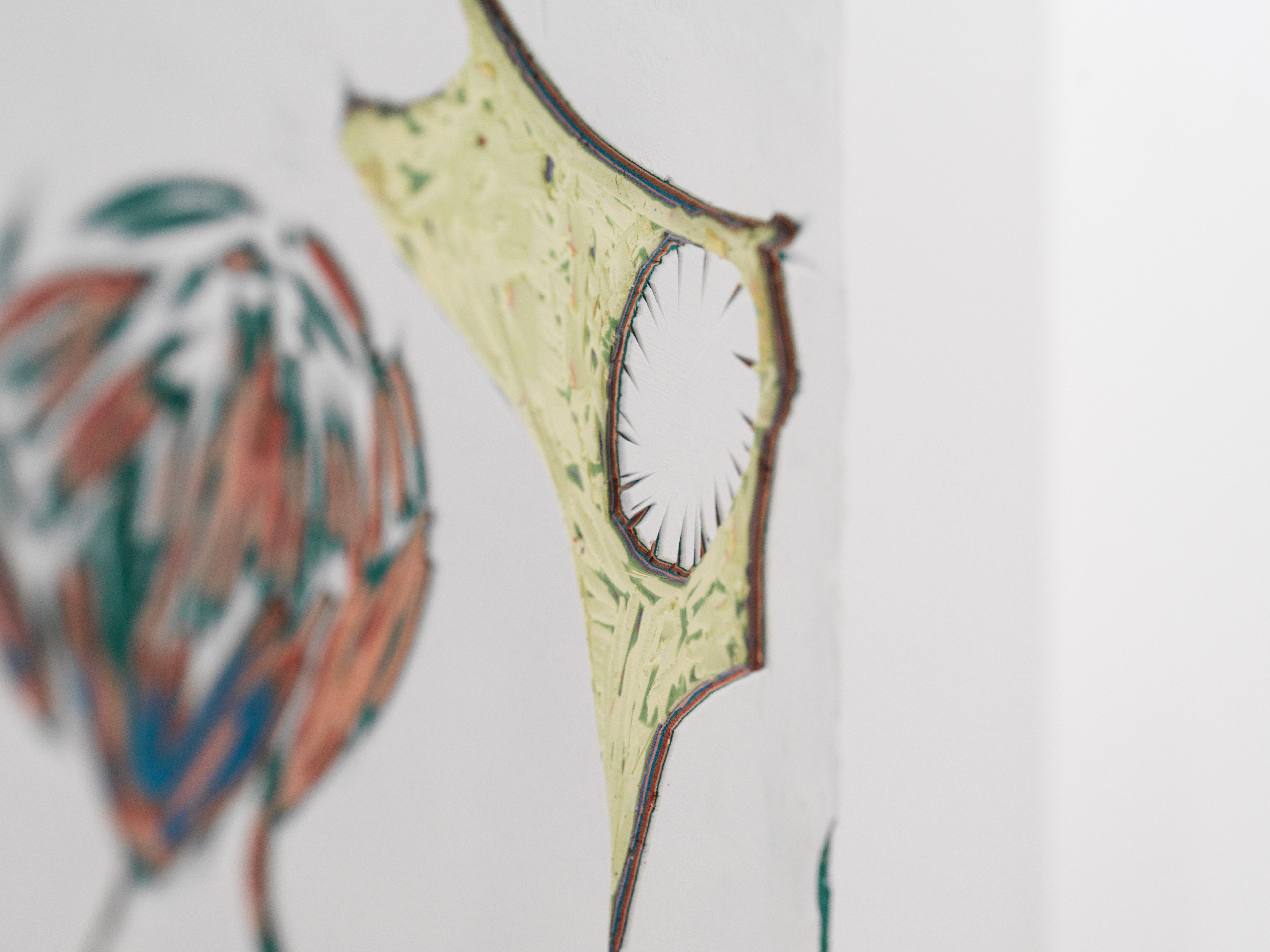 첫 번째 <Strata of Remembrance>는 조각회화 프로젝트이다. 판넬 위에 색상 레이어를 겹겹이 쌓아 올리고 조각하듯이 면을 긁어내어 묻혀있던 색상들을 드러낸다. 이는 할아버지와의 기억을 기반으로 기억 속의 사물 혹은 사건에 대한 이미지를 추상적으로 조각 드로잉한 것이다. 그러므로 조각 드로잉한 색상들은 직접적인 이미지의 형상을 나타내지 않는다. 이는 기억은 실체가 없고 흘러가는 시간 속에서 파편으로만 남는 것을 의미한다. 조각하는 행위로 인해 발생한 다양한 높낮이의 색상을 보며 시각적인 감상 뿐 아니라 촉각적인 일루전을 일으킨다.