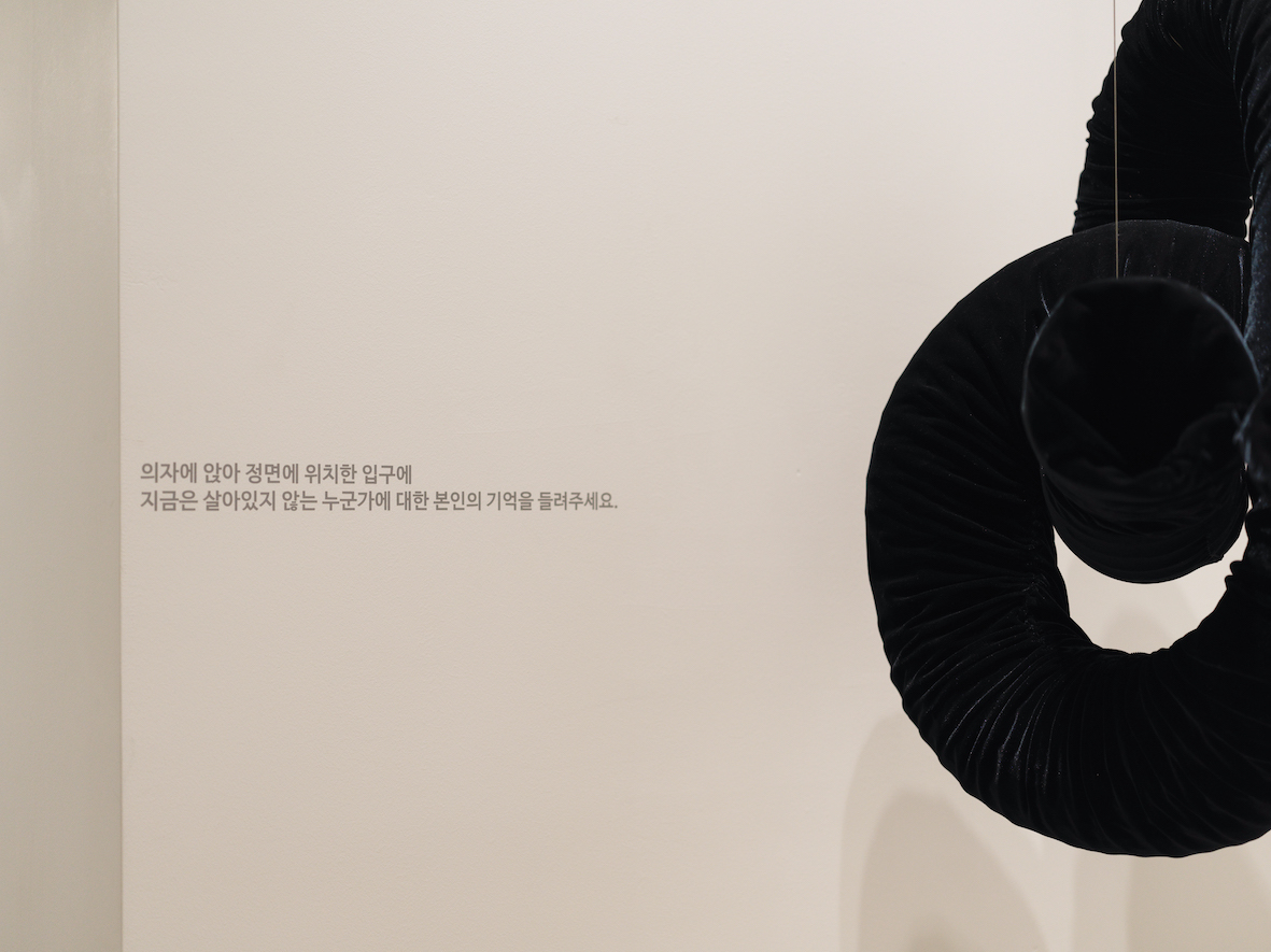 이는 할아버지의 생명이 존재했다는 것을 나의 기억으로 가능하다는 것을 표현함과 동시에 삶과 죽음의 경계가 얼마나 얇고 가볍게 느껴지는지 표현하였다. 시각적으로 볼 때 사람의 몸인 덩어리가 그 사람이라고 인식하지만 그 사람에게서 생명의 상징인 호흡이 사라지면 사람이 아니라 혐오적인 덩어리에 불과하다는 것이 참으로 아이러니하게 느껴졌다. 사람이 진정 살아있는 것은 가시적인 것에 의해 결정되는 것이 아니라 비가시적인 것에 의하여 결부된다는 것임을 생각했다. 생명이란 호흡이 있는 동안에 존재하는 것이고 그 연약하고 비가시적인 속성을 비닐에 빗대어 표현하여 나의 기억을 통해 생명을 불어 넣는다. 할아버지의 기억의 문장들이 가나다 순으로 재배치 된 것은 기억이란 시간의 흐름에 따라 분해되고 재배치되어 명확하지 않게 되는 것을 의미한다. 이와 동시에 송풍기가 작동하며 어떠한 향이 함께 공간을 채우게 되는데 이는 할아버지와 그 시간에 대한 기억의 향수를 일으키는 향으로 작용한다.