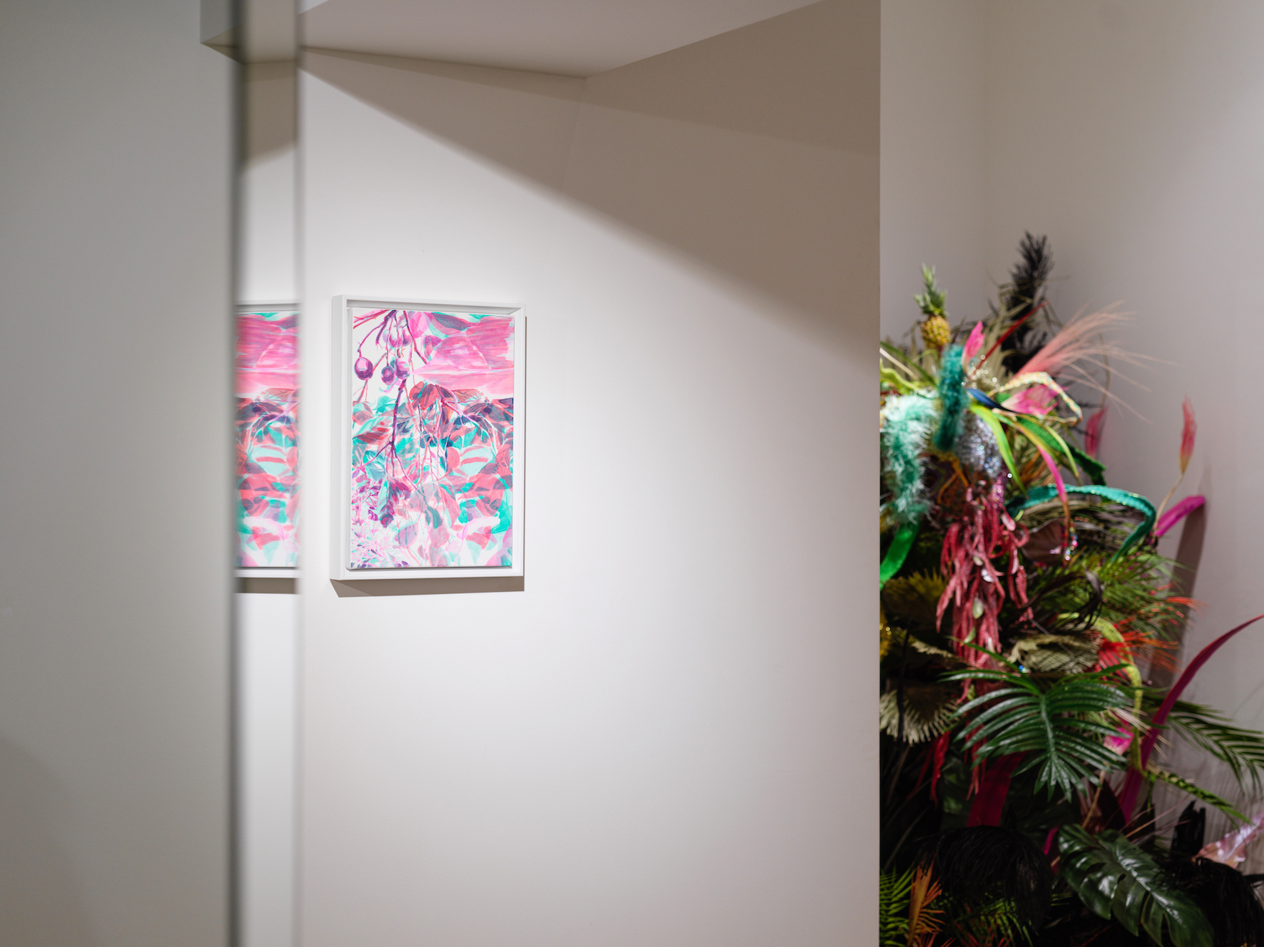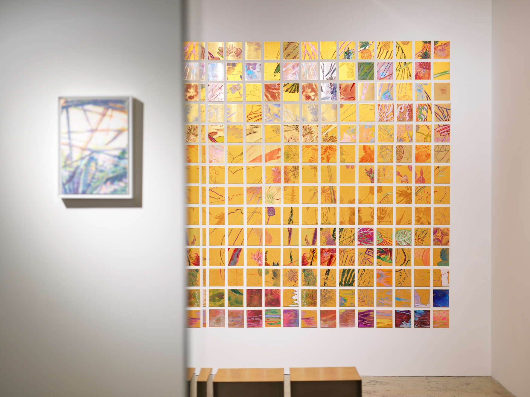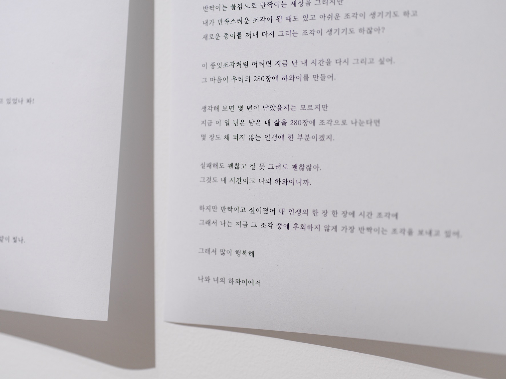 전시장은 최가영과 정민이 각자 그리고 함께 그린 하와이가 서로 대화를 하듯 관객을 맞이한다. 처음 관객을 맞이하는 최가영의 하와이는 마치 꿈의 단편을 떼어 온 듯 각 거울 면에서 서로 반사하며 잡힐 듯 잡히지 않는다. 친구가 잡아주길 바라는 것일까. 그 옆에는 마치 대답이라도 하듯 정민의 간절하고 단단한 하와이가 자리를 잡고 우뚝 솟아 있다. 서로의 하와이를 지나면 함께 보내는 시간이 무엇보다 중요했던 같이 그린 하와이, 280조각이 온기를 품고 걸려있다. 다른 듯 닮고 끊어질 듯 이어지는 280조각의 드로잉은 첫 기획의도답게 그 무엇으로도 바꿀 수 없는 소중한 시간을 주고받은 두 친구의 교환일기를 엿보는 듯하다. 가까이 다가가면 작은 하나의 조각도 금빛으로 반짝인다. 마치 지금 이 순간도 그렇다고 말해주는 것처럼.