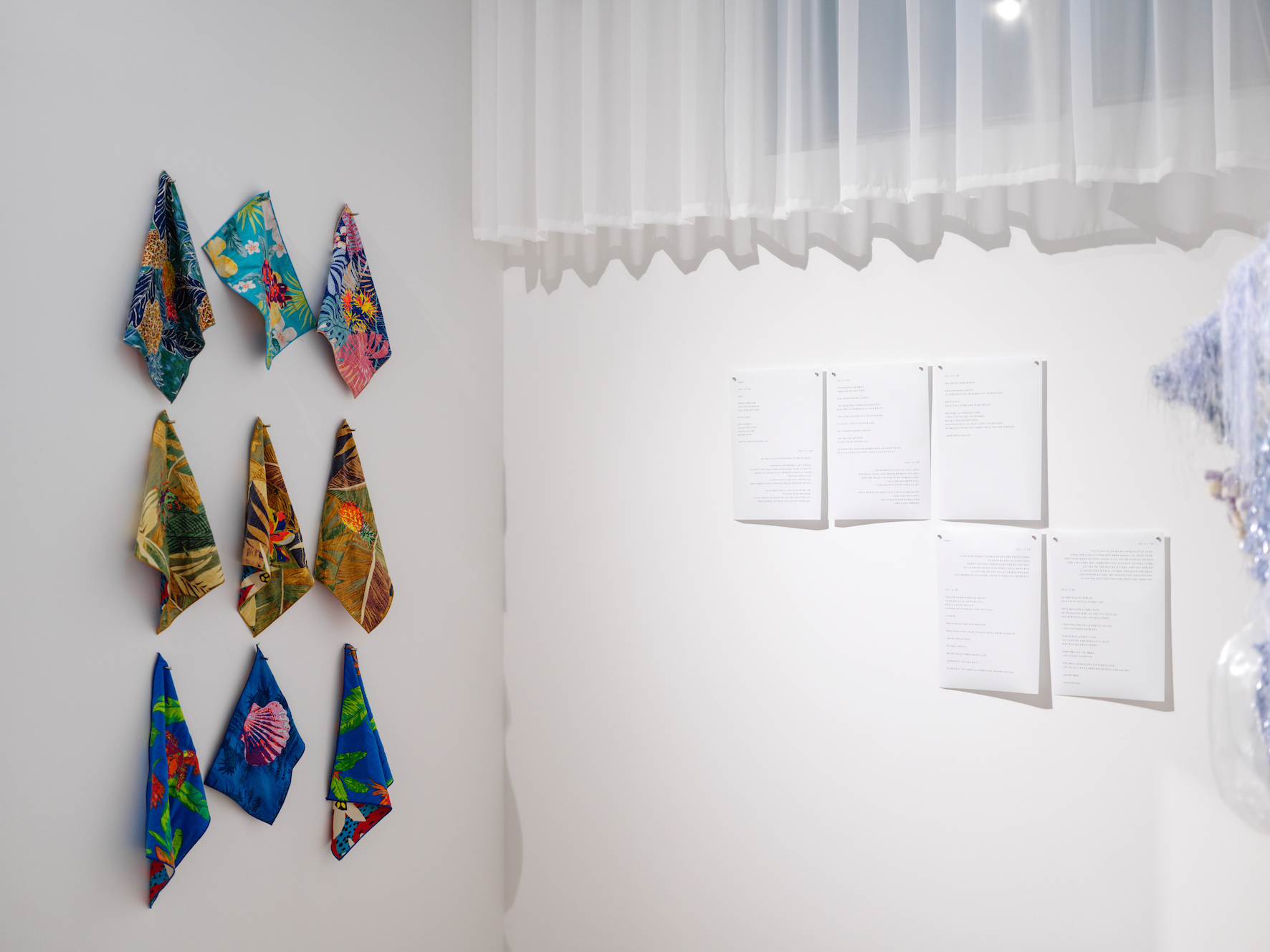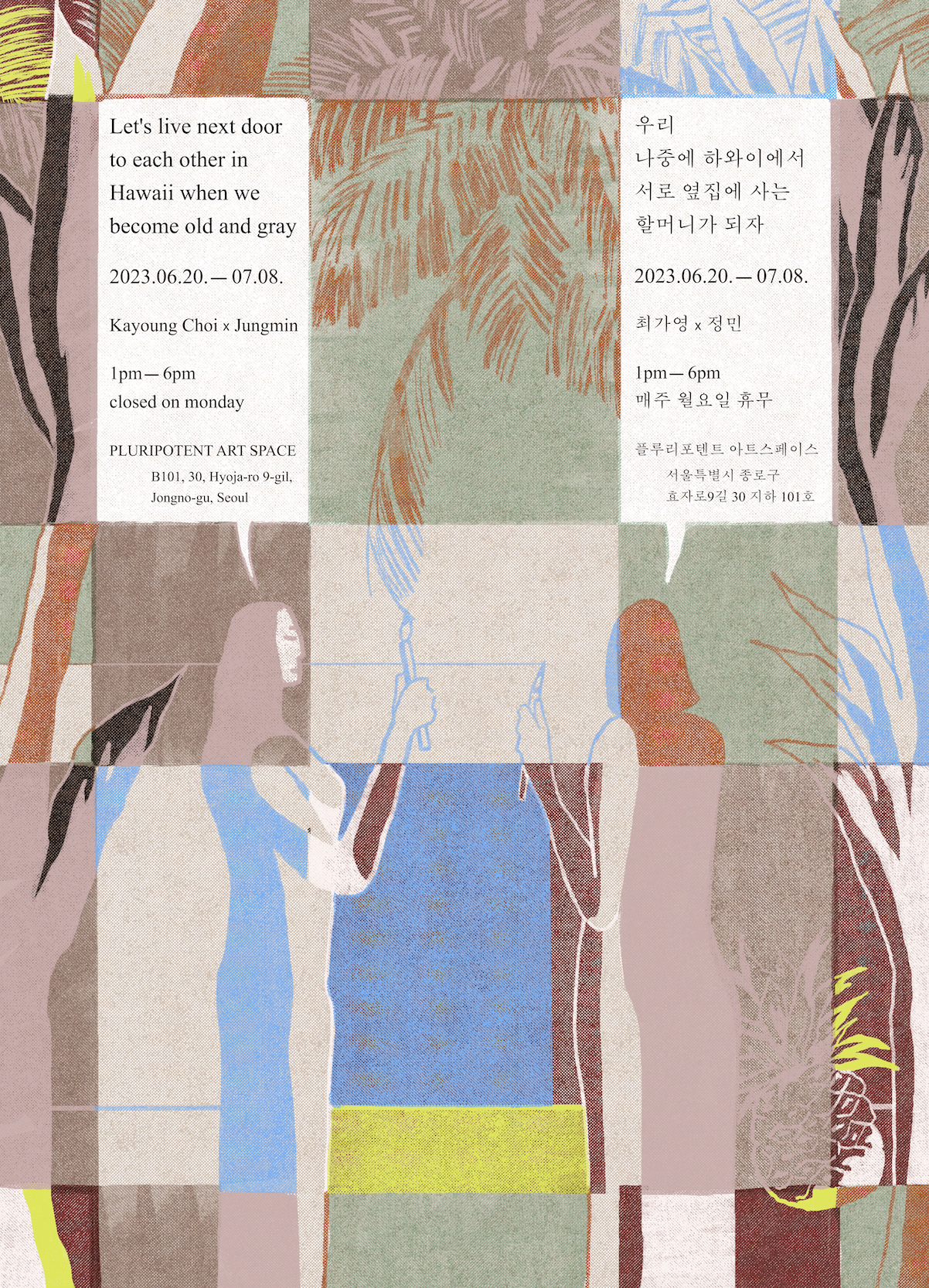 잡힐 것 같지 않던 친구의 시간과 꿈을 함께 다짐하며 시작된 이번 전시 <우리 나중에 하와이에서 서로 옆집에 사는 할머니가 되자>는 최가영과 정민이 작가이기에 앞서 함께 삶을 살아가는 한 사람으로서, 서로의 친구로서 진심을 다해 꾸려졌다. 하와이를 그토록 좋아하던 친구가 하와이를 다시 갈 수 없을지도 모른다는 소식을 듣고 자신의 하와이를 함께 나누며 시작된 이 전시에 어떤 미학적 평가가 어울릴 수 있을까. 누군가 예술의 역할을 묻는다면 나는 감히 이번 전시가 떠오를지도 모른다는 생각을 했다. 전시를 함께 준비하며 두 친구의 교환 일기를 읽을 때마다 나는 본 적 없는 따뜻하고 영롱한 하와이를 떠올렸다.