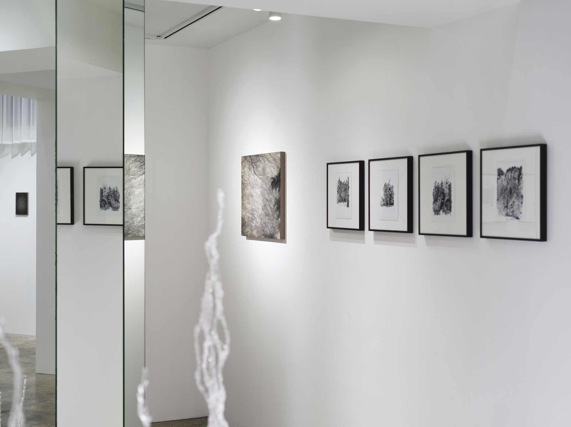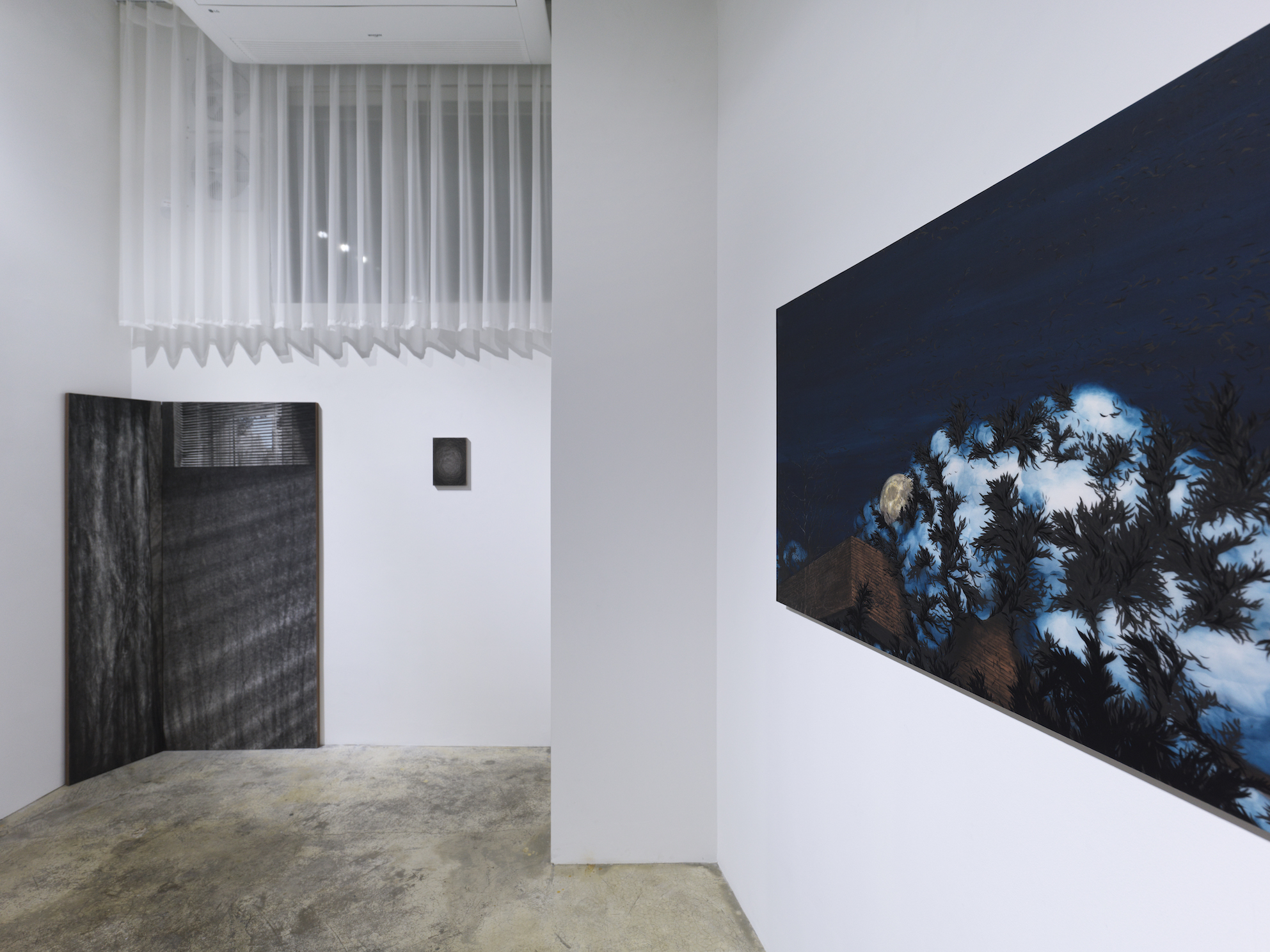 이번 전시<회전하는 그림자>에서는 지금까지의 여정을 돌아보며 잠시 멈추고 머무르는 계기를 갖는다. 앞선 작업들이 삶의 목적을 찾는 태도에서 밖을 향해 있었다면 이번 전시<회전하는 그림자>에서는 오히려 방향도 목적도 갖지 못한 솔직한 내면을 향한다. 시선은 한곳을 향하지 못한 채 하늘과 바닥이 겹치고 날아오르지 못한 획들이 서로 뒤엉키고 때론 응어리져 녹아내린다.