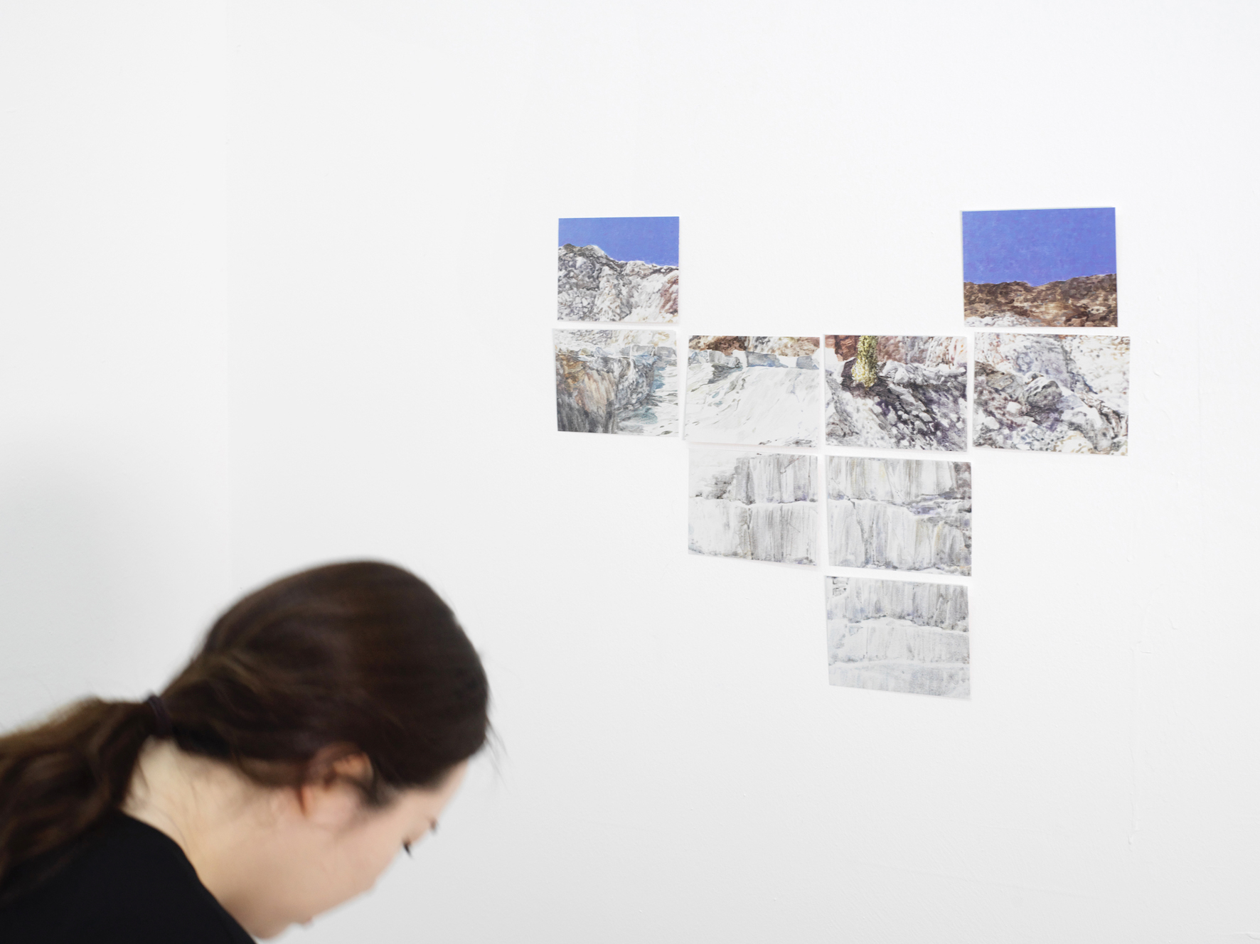 저의 개인적인 관심사와 작업 과정에 대한 생각을 담았습니다. 앞서 말씀 드린 대로 저는 엽서를 수집하는 취미가 있는데요, 엽서 속 풍경이 발신과 수신을 거쳐 전혀 다른 시공으로 옮겨진다는 점에서 흥미가 있어요. 마치 산에서 돌을 캐내어 옮기는 일과 비슷하다고 느낍니다. 헤아릴 수 없이 오랜 세월을 거쳐서 그러한 모양을 하고 그 자리에 있었던 산의 일부를 뚝 떼내어 어딘가로 실어 나르는 채석장 풍경을 보면 여러 가지 감상들이 떠올라요. 그림을 그리는 과정과도 닮아있다는 생각을 합니다. 저의 일상으로부터 채굴된 생각들과 이미지들을 화면이라는 비현실적인 공간 안으로 옮겨서 그려낸다는 점에서요.