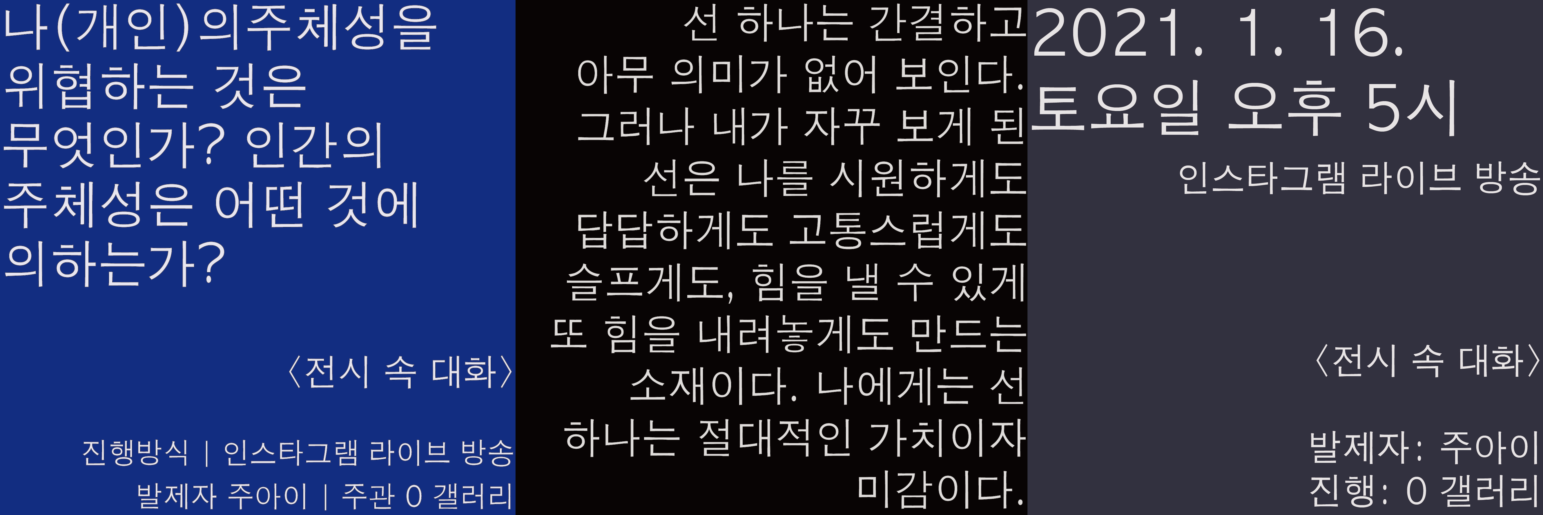 <전시 속 대화>는 전시기간 동안 주아이 작가가 관람객에게 던지는 질문으로 시작합니다. 작가 한 개인의 주제와 고민을 함께 나누고 서로의 생각을 주고받는 계기를 마련하고자 합니다.