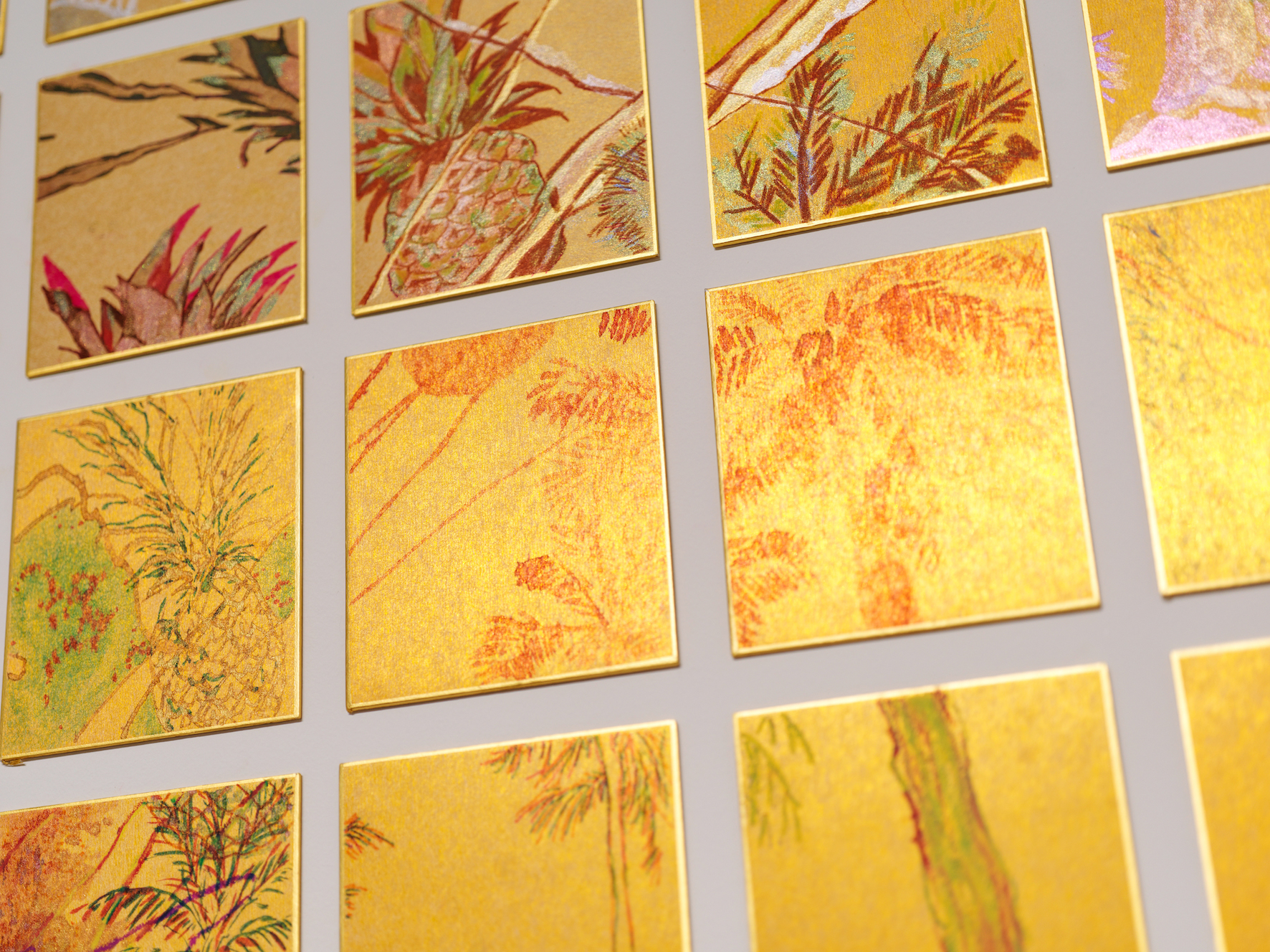 전시장은 최가영과 정민이 각자 그리고 함께 그린 하와이가 서로 대화를 하듯 관객을 맞이한다. 처음 관객을 맞이하는 최가영의 하와이는 마치 꿈의 단편을 떼어 온 듯 각 거울 면에서 서로 반사하며 잡힐 듯 잡히지 않는다. 친구가 잡아주길 바라는 것일까. 그 옆에는 마치 대답이라도 하듯 정민의 간절하고 단단한 하와이가 자리를 잡고 우뚝 솟아 있다. 서로의 하와이를 지나면 함께 보내는 시간이 무엇보다 중요했던 같이 그린 하와이, 280조각이 온기를 품고 걸려있다. 다른 듯 닮고 끊어질 듯 이어지는 280조각의 드로잉은 첫 기획의도답게 그 무엇으로도 바꿀 수 없는 소중한 시간을 주고받은 두 친구의 교환일기를 엿보는 듯하다. 가까이 다가가면 작은 하나의 조각도 금빛으로 반짝인다. 마치 지금 이 순간도 그렇다고 말해주는 것처럼.
